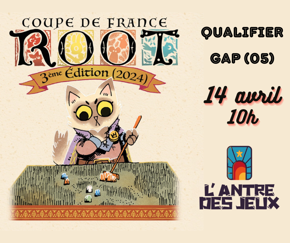 Nous accueillerons le 14 avril prochain une étape qualificative à la Coupe de France du jeu de contrôle de territoires Root ! A cette occasion, à partir de mardi 19 mars et jusqu’à la tenue du qualifier, nous allons proposer des parties d’initiation et d’entrainement au jeu ! Afin de ne rater aucune info sur cette compétition, nous vous encourageons à suivre le salon « Coupe de France Root » sur notre serveur Discord : https://discord.gg/rSrKXyAqUW