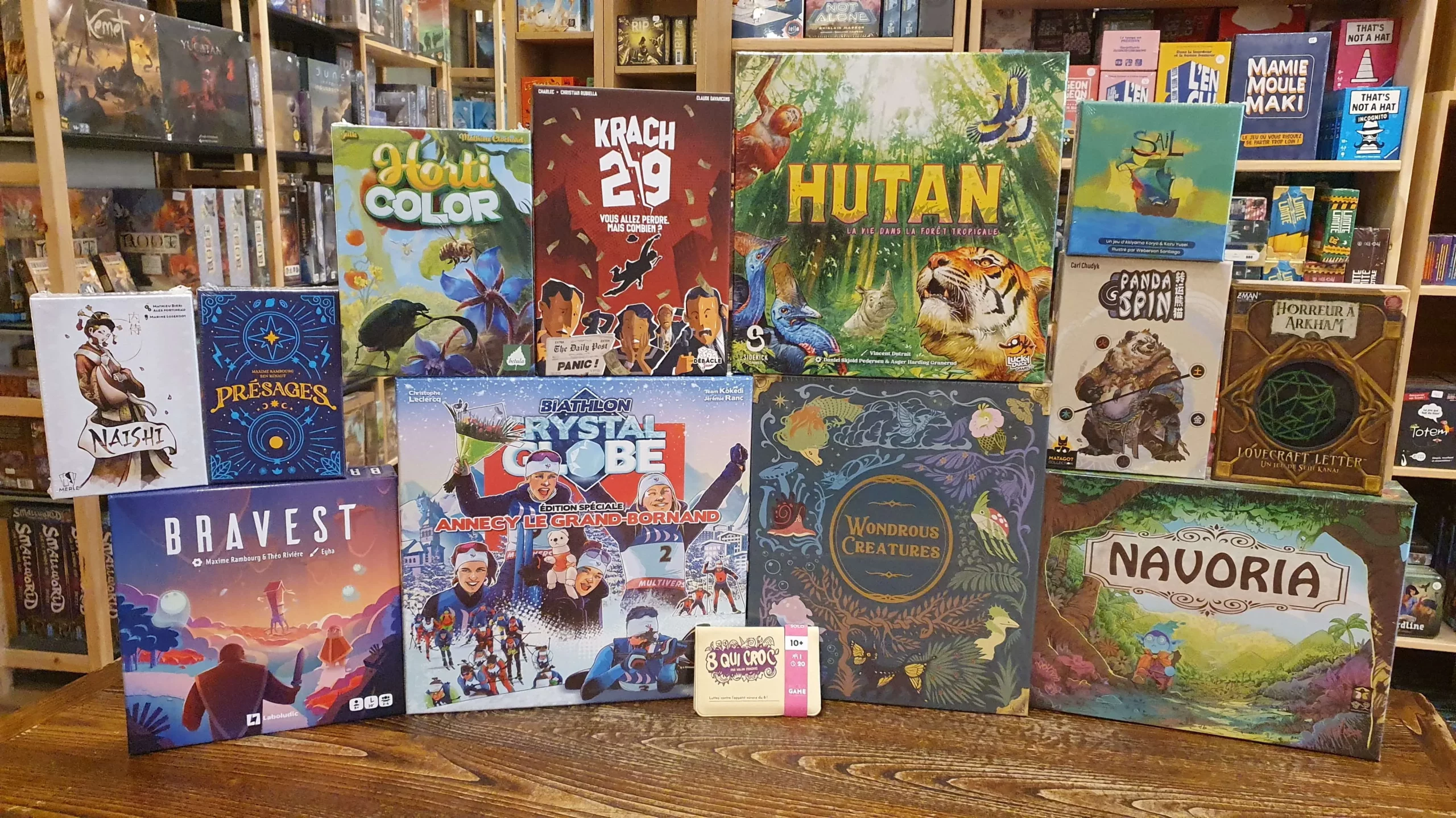Mais aussi, le nouveau Microgames « 8 qui croc », une déclinaison de Love Letter dans l’univers de Lovecraft, une nouvelle version de Crystal Globe au couleur de la Savoie, et enfin, un retour en stock de l’excellent « Naishi » et du jeu complètement fou sur la bourse « Krach 29 », à tester absolument lors de votre prochain passage à l’Antre !